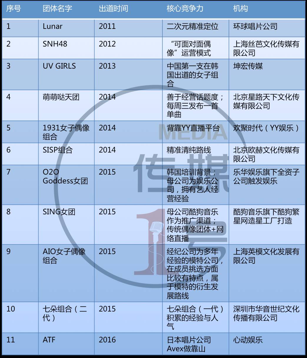 ▲表2:中国本土偶像女团不完全统计