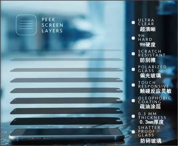 Peek Screen 采用 9H 高硬度钢化膜,防刮划,不怕放口袋和钥匙摩擦,也不怕家里宠物乱扒。