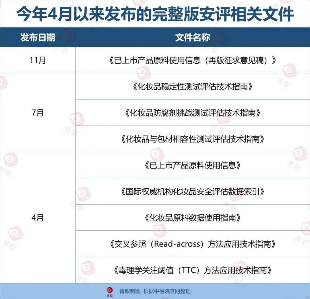 青眼注意到,在《优化措施》发布至今的8个多月中,中检院密集发布《已上市产品原料使用信息》、《化妆品稳定性测试评估技术指南》等多个文件,在缩小原料毒理数据缺口的同时,也在产品的稳定性测试、相容性测试、防腐剂调整测试等方面为企业提供参考依据,为企业平稳落地完整版安评减少障碍。