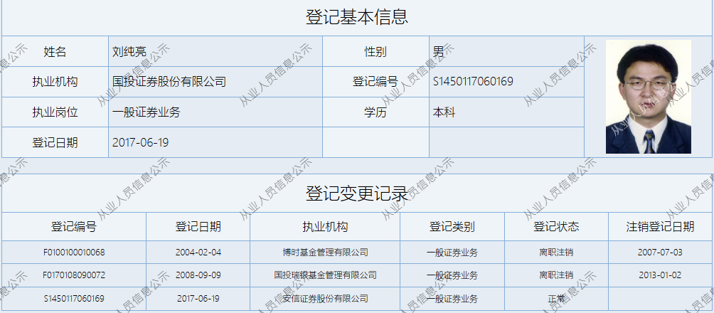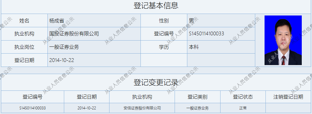 杨成省自2014年10月以来一直在国投证券,任职时间超过10年,财务出身,离职前担任的是财务总监一职。杨成省还曾先后担任空军某部连长、参谋,国家开发投资公司审计室业务主管等。和刘纯亮一样,也曾在安信证券资产管理任职过,担任的是副总经理。