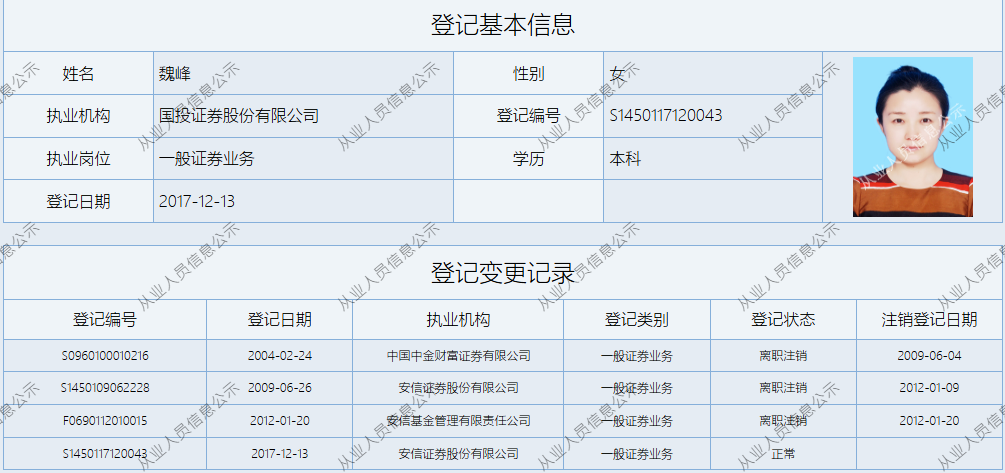 魏峰是资深的证券“女将”,曾先后在中金财富、国投证券(安信证券)、安信基金等部门任职,离职前担任的是国投证券副总经理,在国投证券前后两次任职时间加起来共9年多,再加上在安信基金等公司的任职经历,从2009年到现在,魏峰进入国投系统已达15年以上。