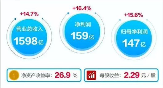 3月30日晚,美的集团发布2016年财报,报告期内实现营业总收入1598亿,同比增长15%;净利润159亿,同比增长16%;归母净利润147亿,同比增长16%;每股收益2.29元。