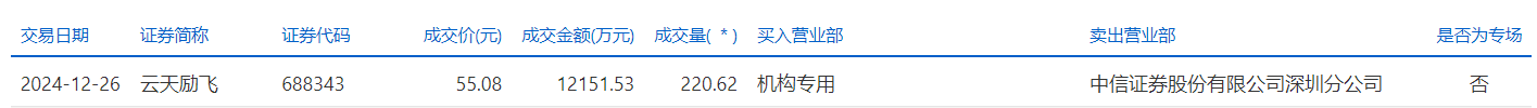 云天励飞-U12月26日大宗交易成交220.62万股,成交额1.22亿元,占当日总成交额的7.95%,成交价55.08元,较市场收盘价56.49元折价2.5%。