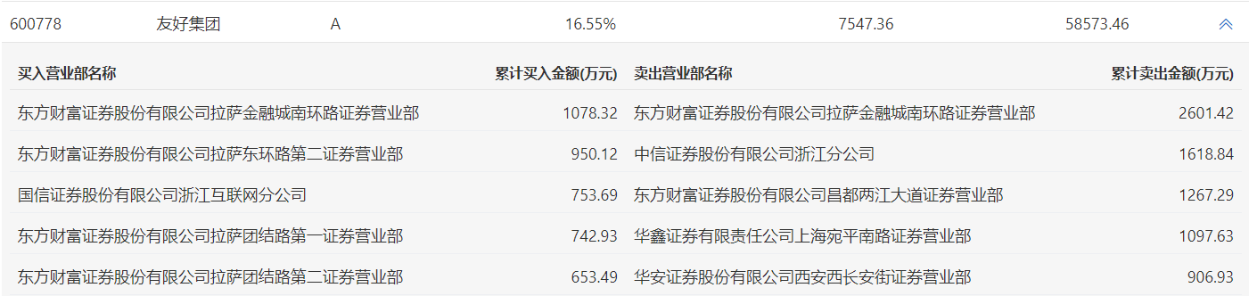 友好集团今日涨0.63%,龙虎榜数据显示,上榜营业部席位全天成交1.17亿元,占当日总成交金额比例为19.92%。其中,买入金额为4178.55万元,卖出金额为7492.11万元,合计净卖出3313.55万元。