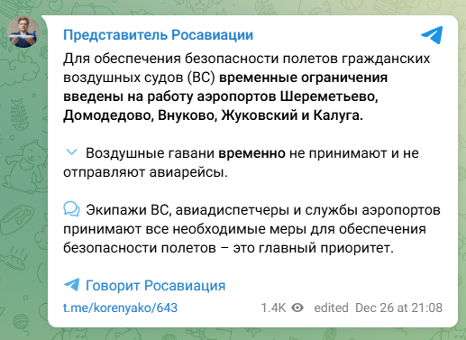 俄罗斯联邦航空运输署发言人12月26日表示,为确保民用飞机的安全,该机构暂时限制了谢列梅捷沃、多莫杰多沃、伏努科沃、茹科夫斯基和卡卢加机场的工作。莫斯科和卡卢加的这些机场停止接收和调度航班。“飞机机组人员、空中交通管制员和机场服务部门正在采取一切必要措施确保飞行安全。这是重中之重。”