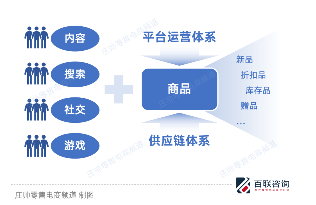 经过多年的实践和研究,「庄帅零售电商频道」发现电商流量来源出现了多样性的特征,总结了“五维流量模型”,包括商品、内容、搜索、社交和游戏五个维度。(游戏主要指种果树、养小鸡、连连看等电商平台内的小游戏)