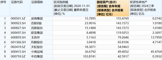 武商集团(000501.SZ)截止三季度的固定资产总额为155.47亿元,近两个月股价涨幅15.8%。此外,百联股份(600827.SH)、欧亚集团(600697.SH)和王府井(600859.SH)等都拥有大额固定资产,且近期股价涨幅有限。