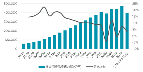中国社会消费品零售总额及同比增速(2004 — 2024年前10月)