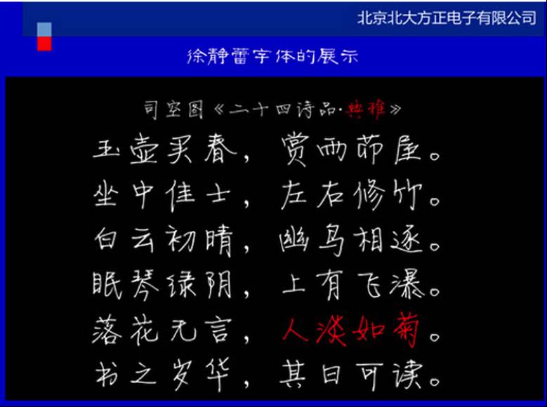 徐静蕾写的一手好字,她所写的字体被方正电子纳入“方正静蕾简体”,这也多亏徐爸爸的“严威”。徐静蕾的父母都是普通工人,下面还有一个弟弟,小时候也没有自信,又瘦又黑,还不喜欢学习,父亲就“逼着”她在市少年宫书法班学习,每日练习书法,还要背诵唐诗。后来因为书法专长,她还被保送进北京朝阳区一所中学。后来父亲从工厂辞职做霓虹灯工厂,为了节约成本,徐爸爸让自己的女儿写灯箱上的字。