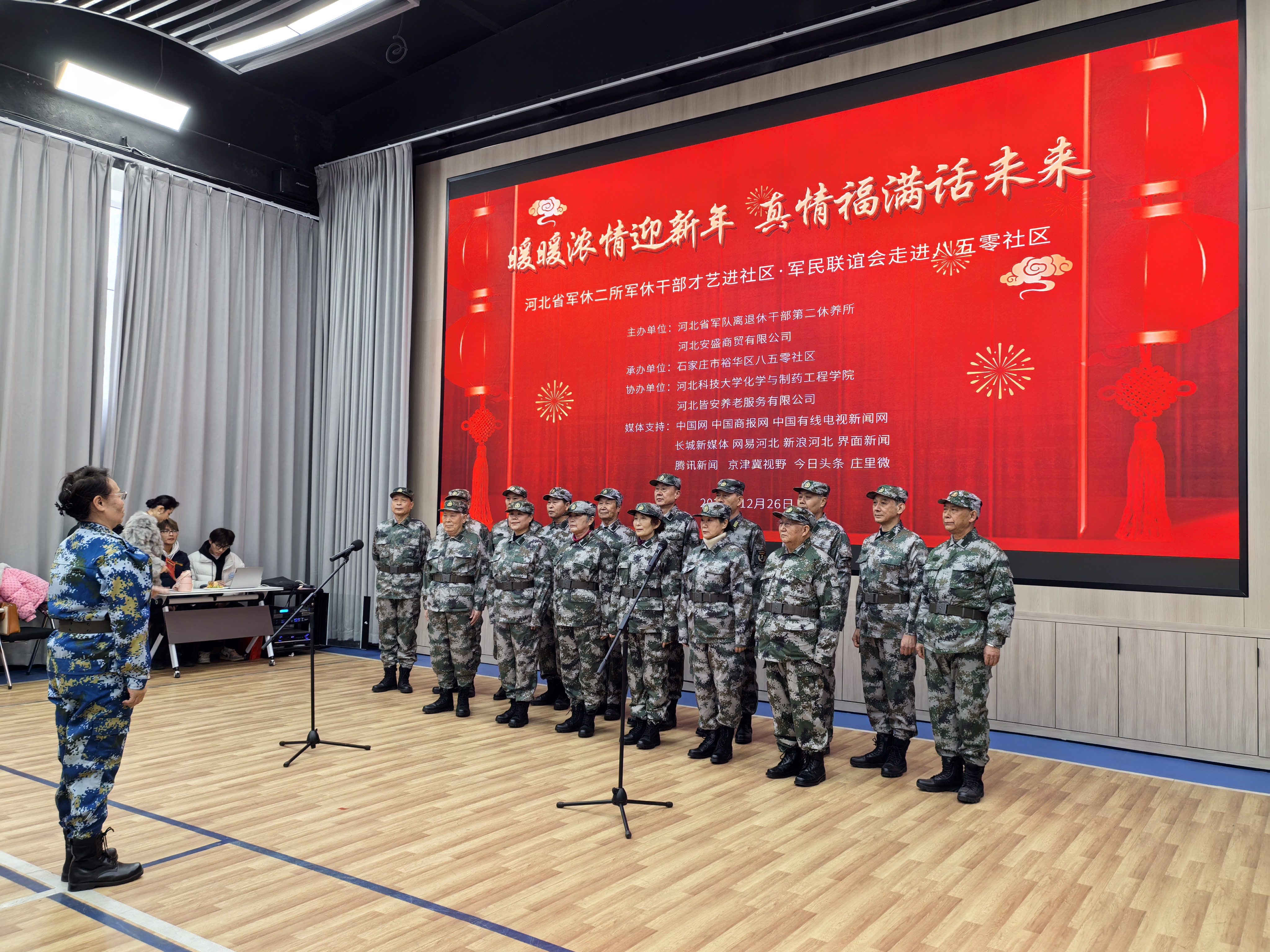 12月26日,由河北省军队离退休干部第二休养所、河北安盛商贸有限公司主办,石家庄市裕华区裕兴街道八五零社区承办,河北科技大学化学与制药工程学院、河北皆安养老服务有限公司协办,主题为“暖暖浓情迎新年 真情福满话未来”——河北省军休二所才艺进社区·军民联谊会走进八五零社区公益活动在八五零社区党群服务中心举行。
