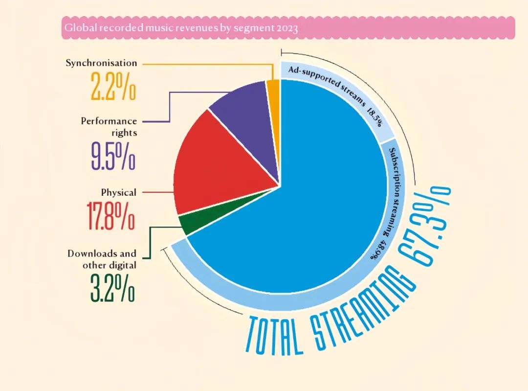 今年3月21日,国际唱片业协会IFPI发布了《2024年全球音乐报告》。数据显示,2023 年全球录制音乐收入连续第九年增长,增幅 10.2%,达到 286 亿美元。其中流媒体占总收入的67.3%。这意味着,尽管音乐流媒体高速增长的时期已然成为过去,但流媒体仍是市场增长的最大驱动力。