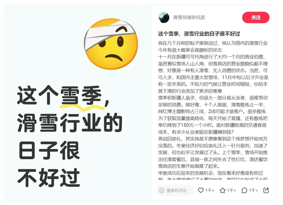 12月23日,曾拍摄谷爱凌、苏翊鸣的纪录片导演张绍波,在自己的社交平台发布了一篇“这个雪季,滑雪行业的日子很不好过”的帖子。