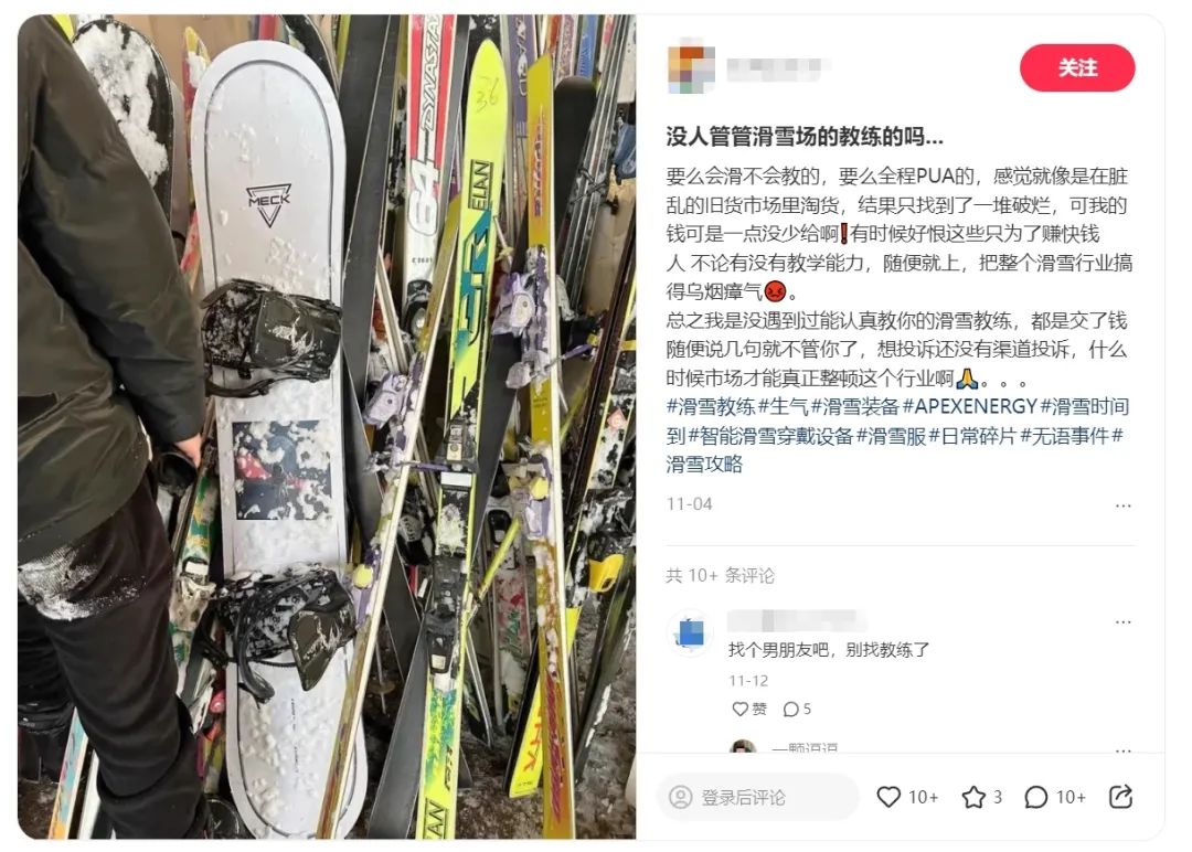 滑雪圈也是如此。对于刚入坑的滑雪初学者来说,滑雪教练市场乱收费、不好好教的乱象,甚至容易直接劝退消费者。前两天刚去崇礼滑雪的肆肆就曝光了对方教练员混时长的乱象。一名业内人士也表示,目前国内的滑雪教练市场较乱,存在许多没有教学资质的野教练,专攻0基础教学,收费在300-500元/小时之间。