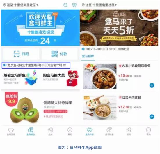 在3月7号,盒马鲜生App上曾显示北京十里堡店将于3月31日正式开业,并开放了在十里堡周边地区的线上配送业务,包括盒马鲜生和盒马外卖两部分。
