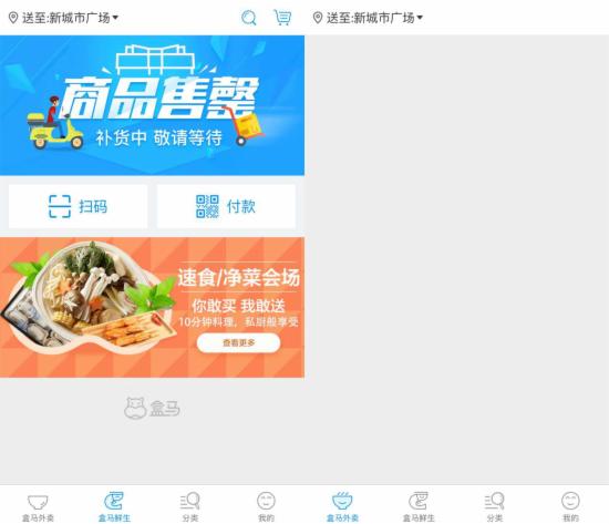 同时,盒马鲜生和盒马外卖的线上配送业务也已经终止,早先频繁出入的外卖送餐员已不见踪影。快快打开盒马鲜生App时发现,盒马外卖界面显示为空,盒马鲜生的界面也显示商品售罄。而商品分类的菜单栏中,虽然包含了不少商品种类,但均显示已售完或没有找到相关商品。