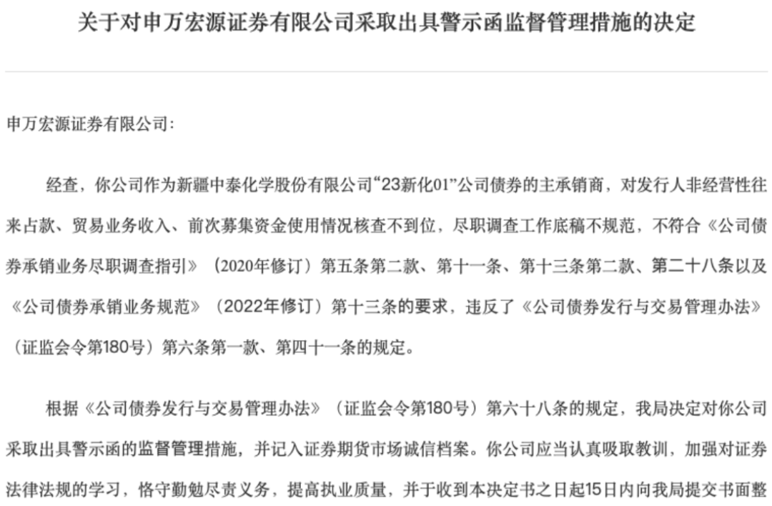 然而半年多过去,此事仍有余波,12月24日,申万宏源证券有限公司(以下简称“申万宏源证券”)作为中泰化学“23新化01”公司债券的主承销商收到警示函。
