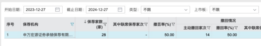 Wind数据显示,近一年以来(截至12月27日),申万投行共保荐28家企业,主动撤回14家,撤否率达50%。