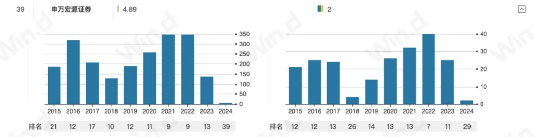 Wind数据显示,2024年,申万宏源证券股权承销项目两个,承销金额4.89亿元;而2023年股权承销25家,承销金额达137.42亿元。