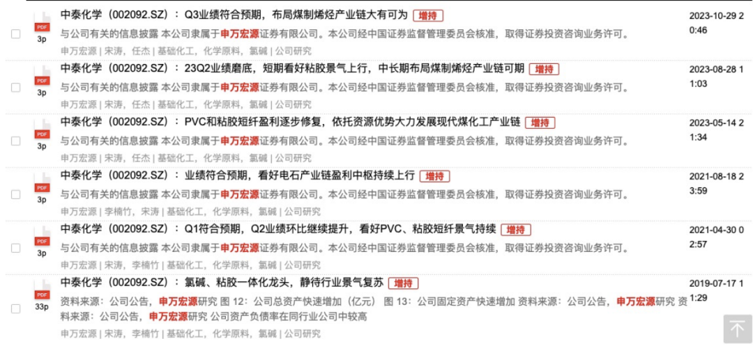 此外,Wind数据显示,申万宏源证券长期对中泰化学维持“增持”评级,最近一期在2023年10月。