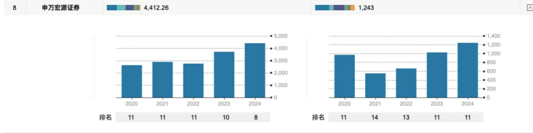 这种情况之下,债券承销业务成为了申万宏源证券投行条线的重要支撑。Wind数据显示,2024年,该公司债券承销1243支,承销金额4412.26亿元,在95家券商中排名第8。