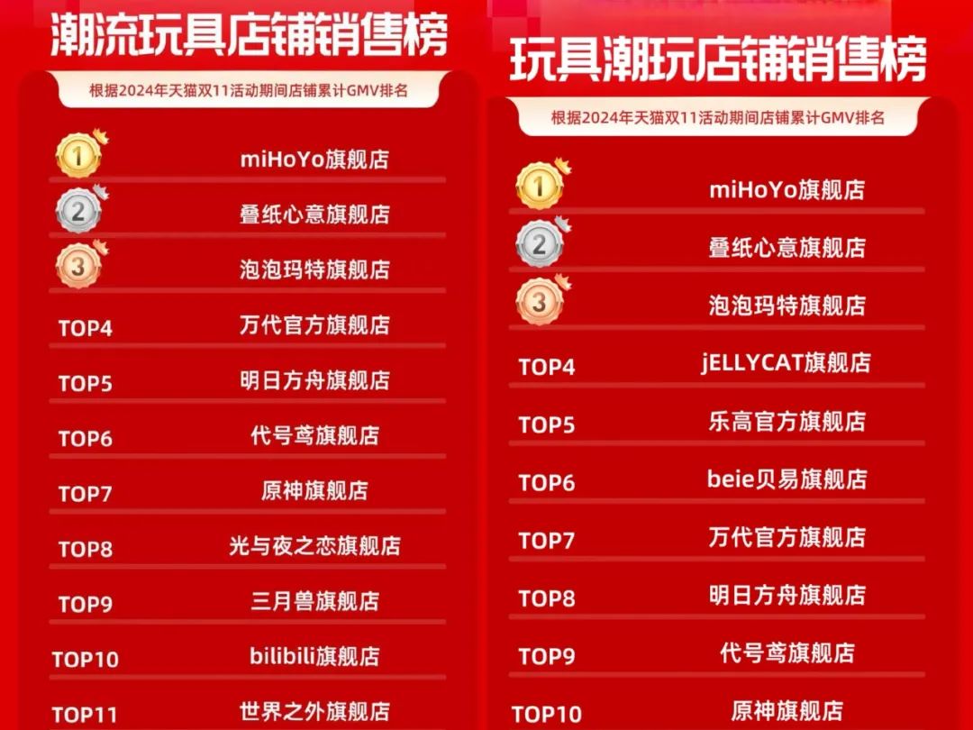 再看一组双十一的数据,根据2024年天猫双11全周期(10月21日-11月11日)品牌成交榜单显示,旗下拥有乙游《未定事件簿》的米哈游,其旗舰店成为今年度双11首个破亿品牌,且位玩具潮玩店铺销售榜、潮流玩具店铺销售榜双榜第一;叠纸工作室的“叠纸心意旗舰店”则位居双榜第二。