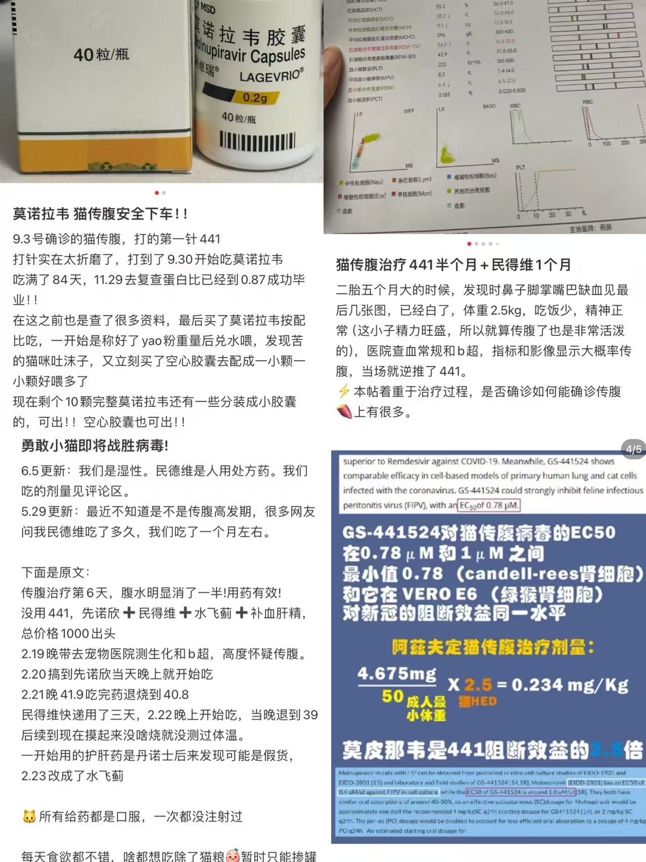 如在小红书等社交媒体上,包括“莫诺拉韦猫传腹安全下车”、“猫传腹治疗441半个月+民得维1个月”、“没用441,先诺欣+民得维+水飞蓟+补血肝精,总价1000出头”、“阿兹夫定猫传腹治疗剂量”这类的笔记已不在少数。