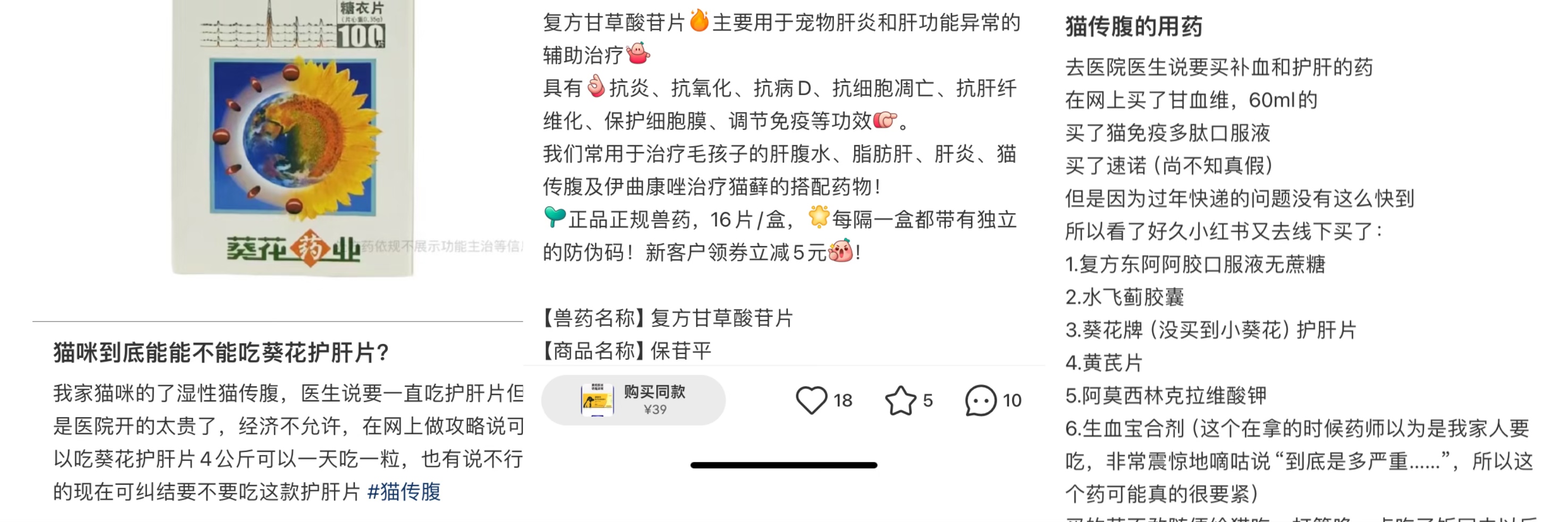 目前来看,若是在社交媒体上搜索“猫传腹”、“猫传腹治疗”、“猫传腹治疗药物推荐”一类的关键词,441和2801(莫诺拉韦)依旧是出现最多的关键词,新冠治疗药物的曝光量并不及它们。同时, “猫传腹护理”“猫传腹护肝片”的讨论也不少,其中复方甘草酸甘片、葵花护肝片、水飞蓟等产品也有出现。