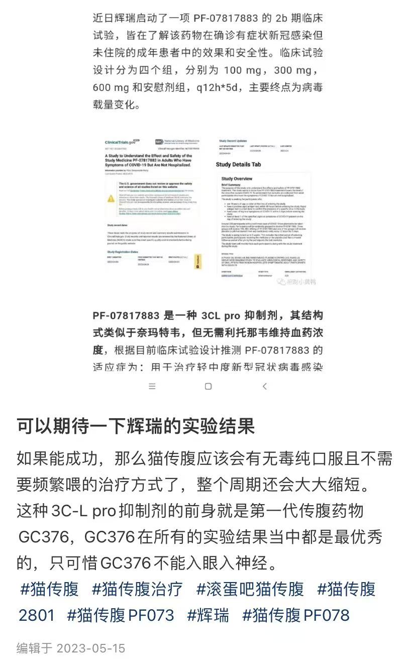 例如,在辉瑞(Pfizer)公司宣布尝试研究3CL抑制剂单药是否可用于新冠治疗时期,国内社交媒体上就出现了关于此类产品是否可用来治疗猫传腹的讨论。不过,作为国内首款获批的新冠口服药,Paxlovid在获批之初是非常难购获的产品。目前,社交媒体上鲜有Paxlovid治疗猫传腹的案例分享。