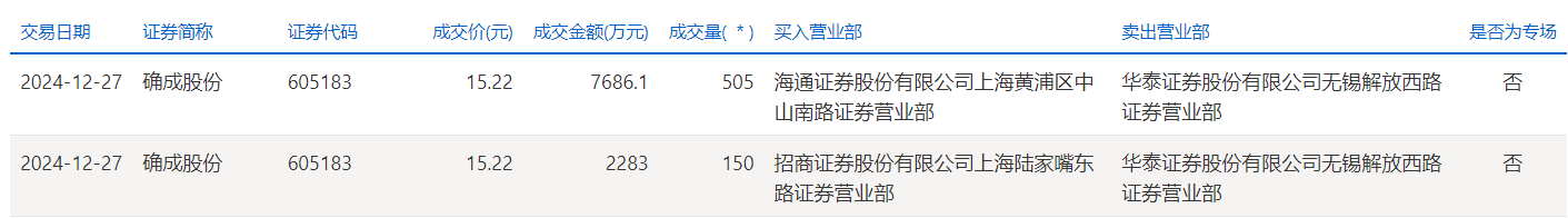 确成股份12月27日大宗交易成交655万股,成交额9969.1万元,占当日总成交额的69.23%,成交价15.22元,较市场收盘价17.17元折价11.36%。