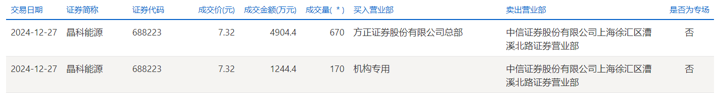 晶科能源12月27日大宗交易成交840万股,成交额6148.8万元,占当日总成交额的11.3%,成交价7.32元,较市场收盘价7.43元折价1.48%。
