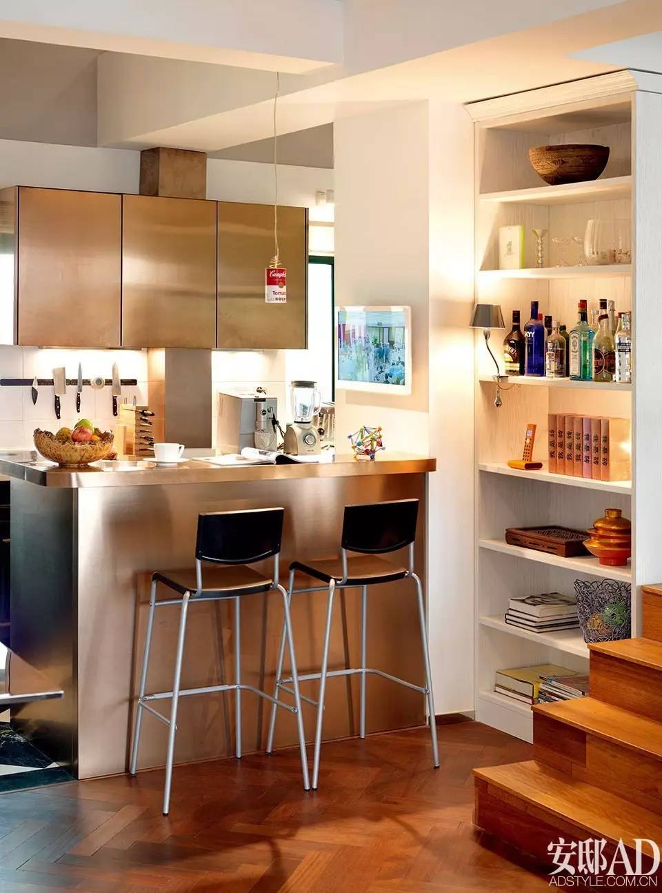 不锈钢饰面的橱柜和岛台散发着冷电子乐般气息的厨房是丈夫的最爱。