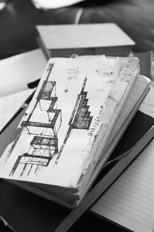 在飞机上,在三万英尺的高空,在云层之上,往往是最有灵感的时候。陈暄会用笔在笔记本上涂涂画画,有时是设计草图,有时是随手记下了的一些想法。飞机上只能用铅笔,因为其他的水笔会因为压力而喷发出墨水来。陈暄有很多笔记本,有些是磨烂了边儿的。她总是在这些本子上涂涂写写的,里边除了建筑手稿之外还有诗歌和时装设计的初稿。