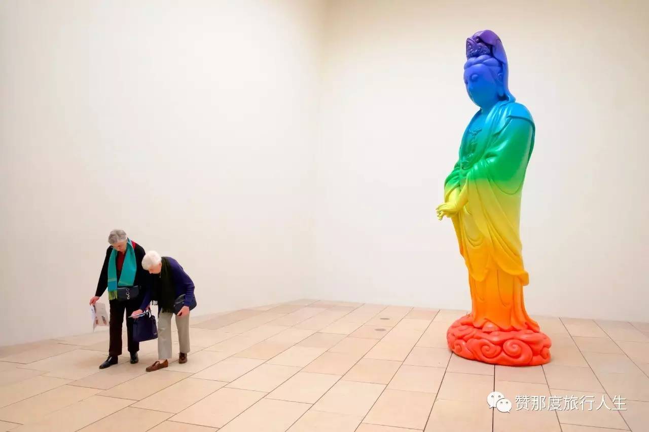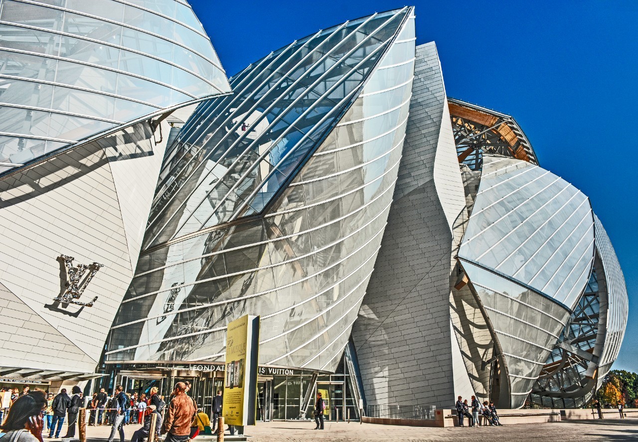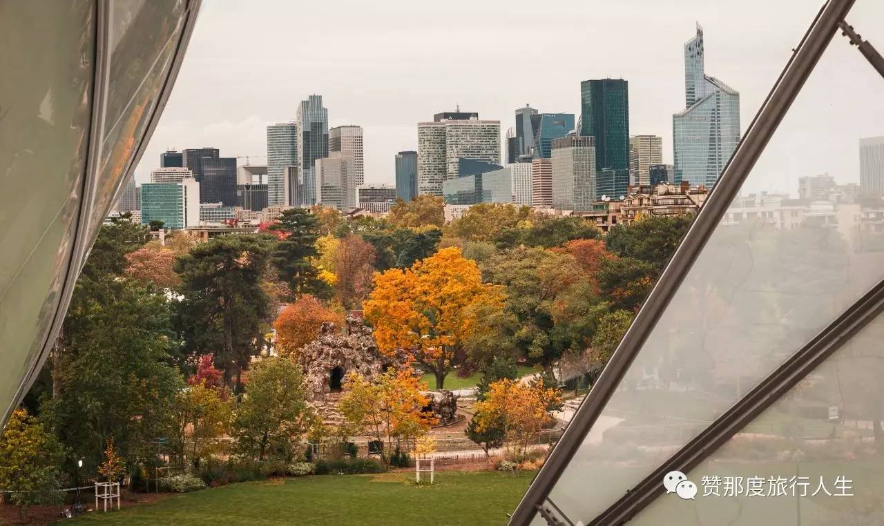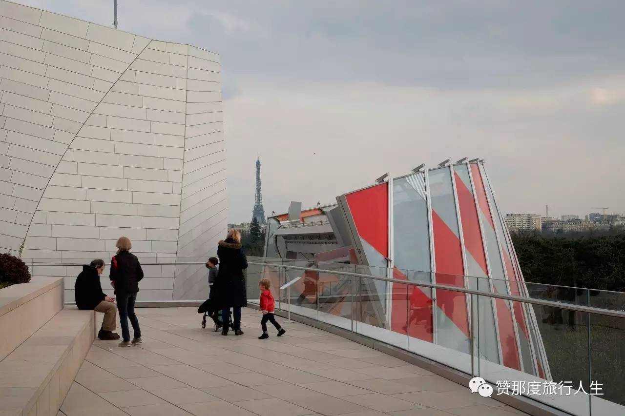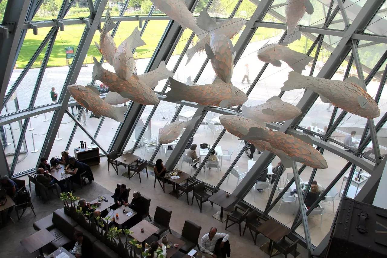 整个博物馆里除了咖啡厅用箱子做了一个装置,除此之外没有LV logo的植入,收藏的艺术家的作品,所有建筑物的顶端都是平台,在这些平台上不同角度能俯瞰巴黎的著名建筑。这些角度都是建筑师精心选择的。