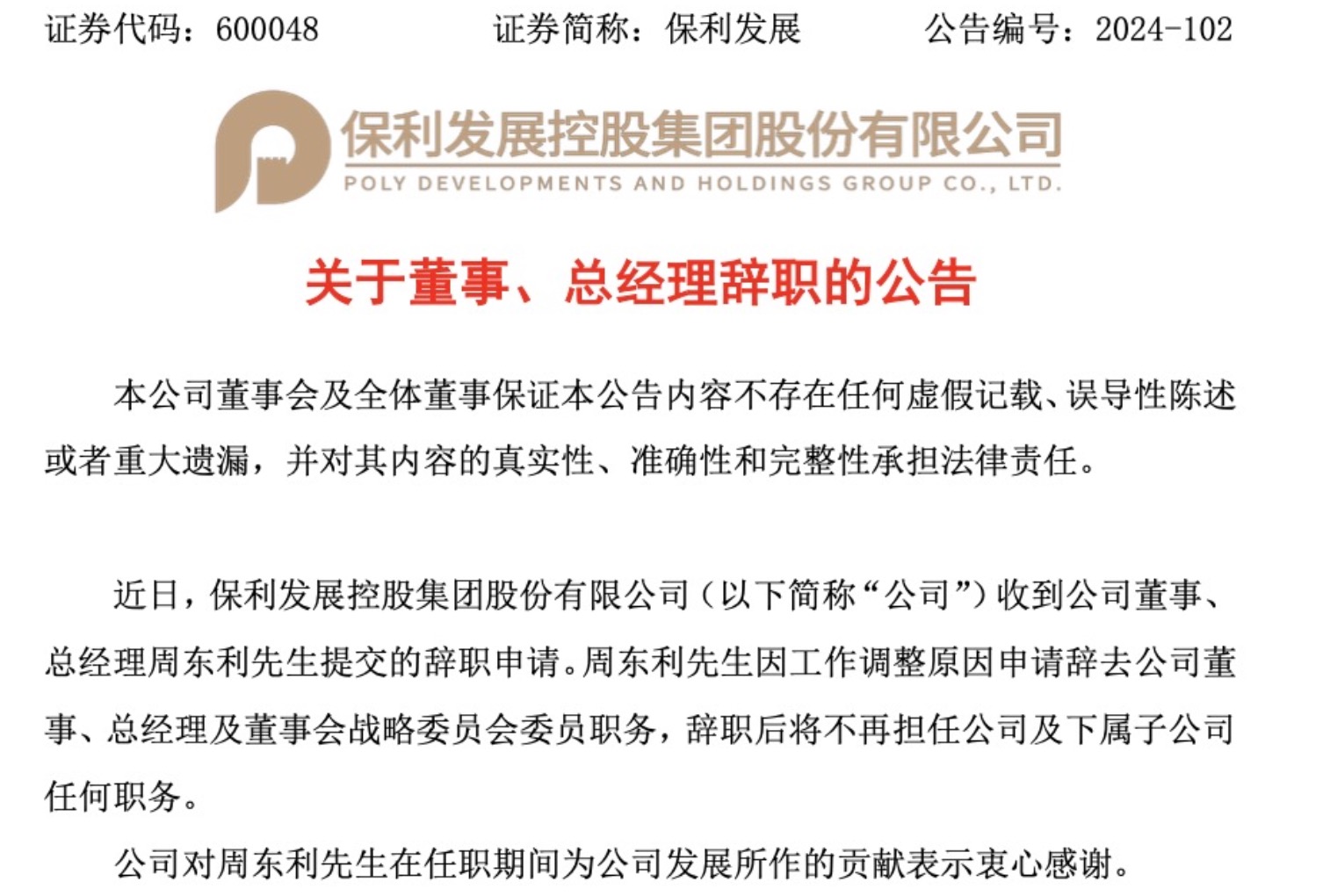 12月27日晚间,保利发展发布一则人事变动公告称,公司于近日收到公司董事、总经理周东利提交的辞职申请。