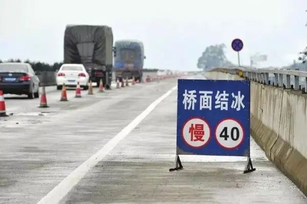 开车经过桥梁、高架道路、匝道等容易结冰的路段时,必须加倍小心,放缓车速。