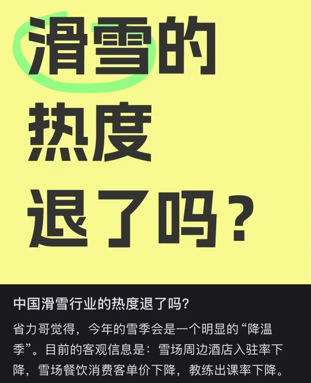 但另一端,在今年的雪季,一些教练注意到了明显的“降温”现象。他们反映,“雪场周边酒店的入住率下降,雪场内的餐饮消费客单价降低,教练的出课率也在减少。”