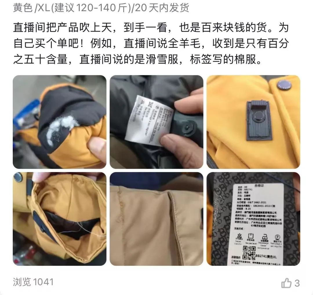 据了解,“BB”是“澳门COCO姐”的原创品牌,市场反馈中存在不少差评。“客服信誓旦旦说50%羊毛但拆开全是珍珠棉”“直播间说的是滑雪服,但标签上写的棉服”等问题也是许多低价滑雪服的通病,也有不少消费者表示“买的时候就当作棉服来穿并不是滑雪服”。