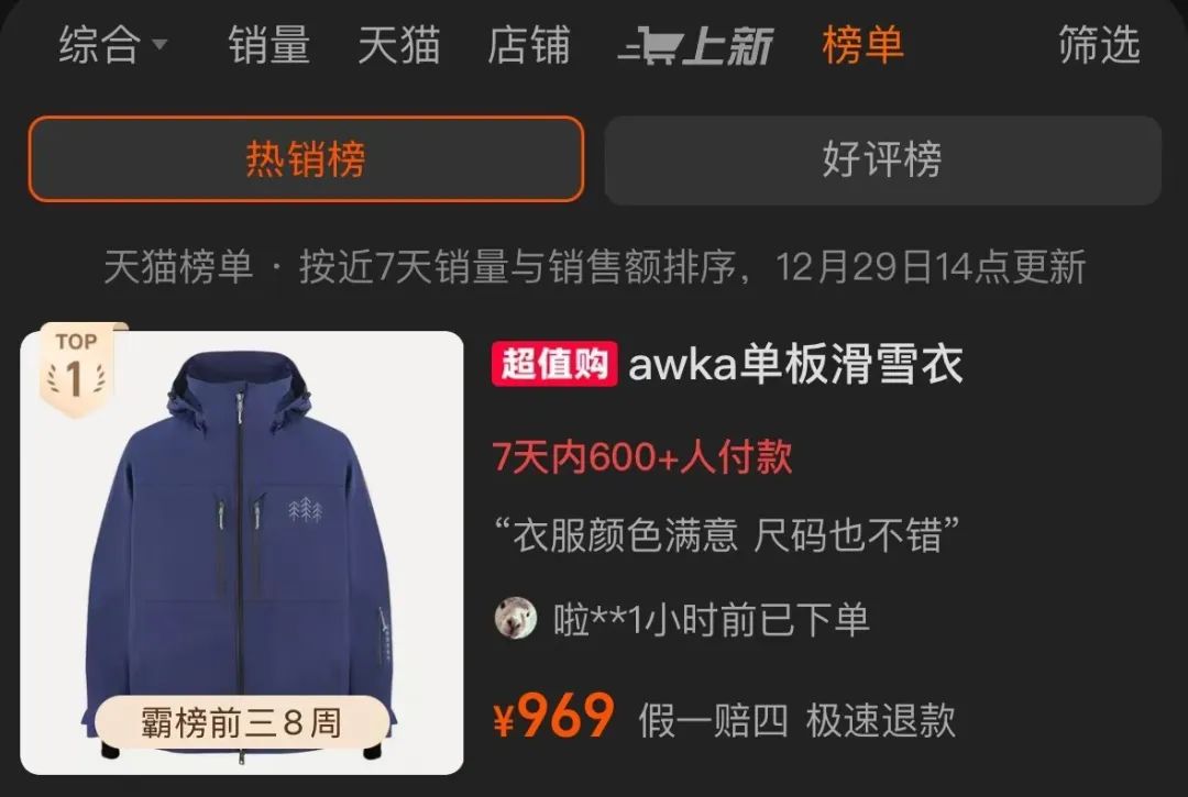 天猫榜单显示,销售额前十的品牌包括南恩、awka、ISEE MIGGA、KK树、phenix和蕉下,大多是国产品牌,其中awka和ISEE MIGGA均为近年崛起的国产滑雪用品品牌,awka969元的单板滑雪衣霸榜前3八周,也被许多滑雪爱好者称为“国货之光”。