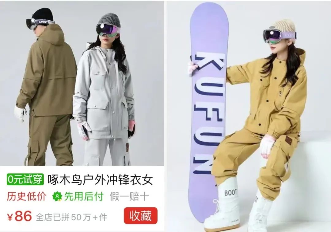 低价大旗被大量白牌接过,甚至击穿底价。直观的例子是,在拼多多平台上,「滑外滑雪服饰R」的滑雪裤价格在80-100元之间,全店已拼超过十万件;「啄木鸟」品牌的滑雪服外套不超过90元,整套拿下也不超过200元,全店拼单已超过五十万单。