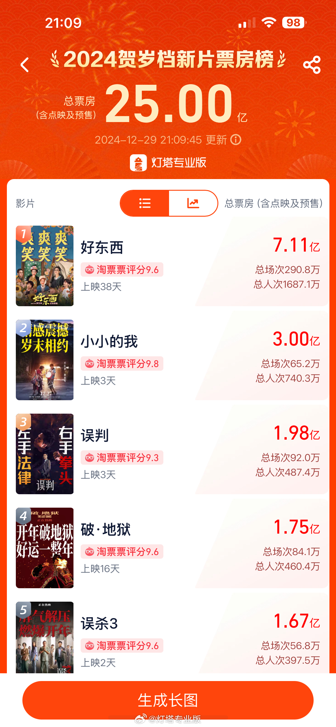 据灯塔专业版,截至12月29日21时09分,2024年贺岁档上映新片总票房(含点映及预售)突破25亿。