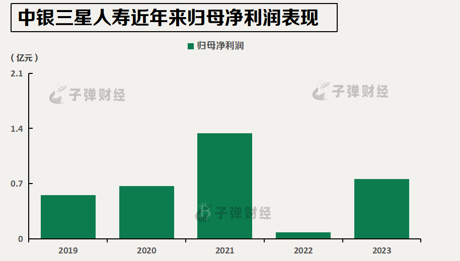 数据显示,2019年、2020年,中银三星人寿归母净利润分别0.55亿元、0.67亿元,仅在2021年大涨实现归母净利润1.34亿元,2022年和2023年实现归母净利润0.08亿元和0.76亿元。