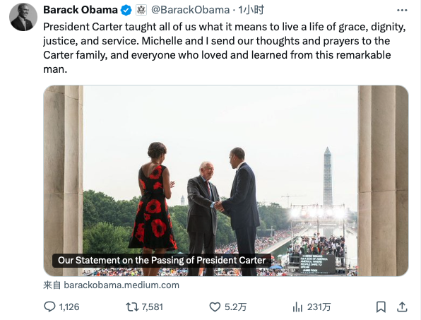 奥巴马称:“每当我有机会与卡特总统共度时光时,很明显,他不只宣扬这些价值观,更会身体力行。在这样做的过程中,他教会了我们所有人如何过一种优雅、尊严、正义和奉献的生活。我和米歇尔对他的思念与祈祷,同卡特的家人以及所有爱过这位了不起的人并向他学习的人同在。”
