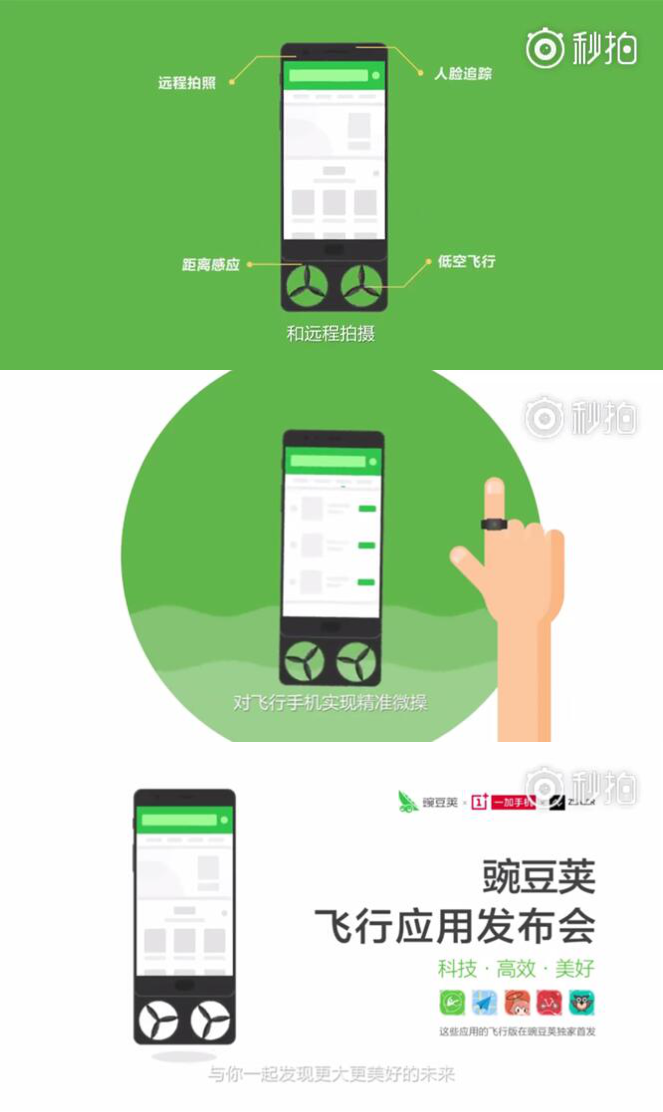 豌豆荚联合@一加手机 @ZEALER中国 @高德地图 @腾讯动漫微博 @咕咚网 @摩拜单车mobike @inke映客 七大品牌,推出黑科技感十足的「飞行应用发布会」,让你解放双手,换一种姿势重新认识手机和 app。