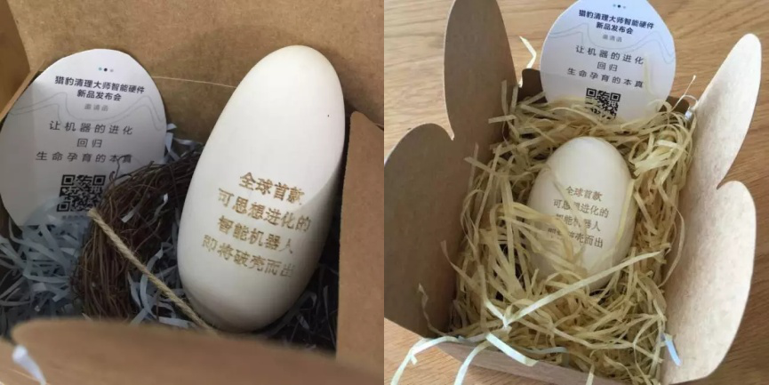 这是猎豹移动旗下的猎豹清理大师即将发布的一款智能硬件产品——“全球首款可思想进化的智能机器人”的预热营销,因机器人存在一个蛋状形态的硬件里,就很巧妙地做了一个真的蛋伴随媒体邀请函一起发出,于是,虽然机器人的发布会还没开,但这颗蛋已经开始火了。