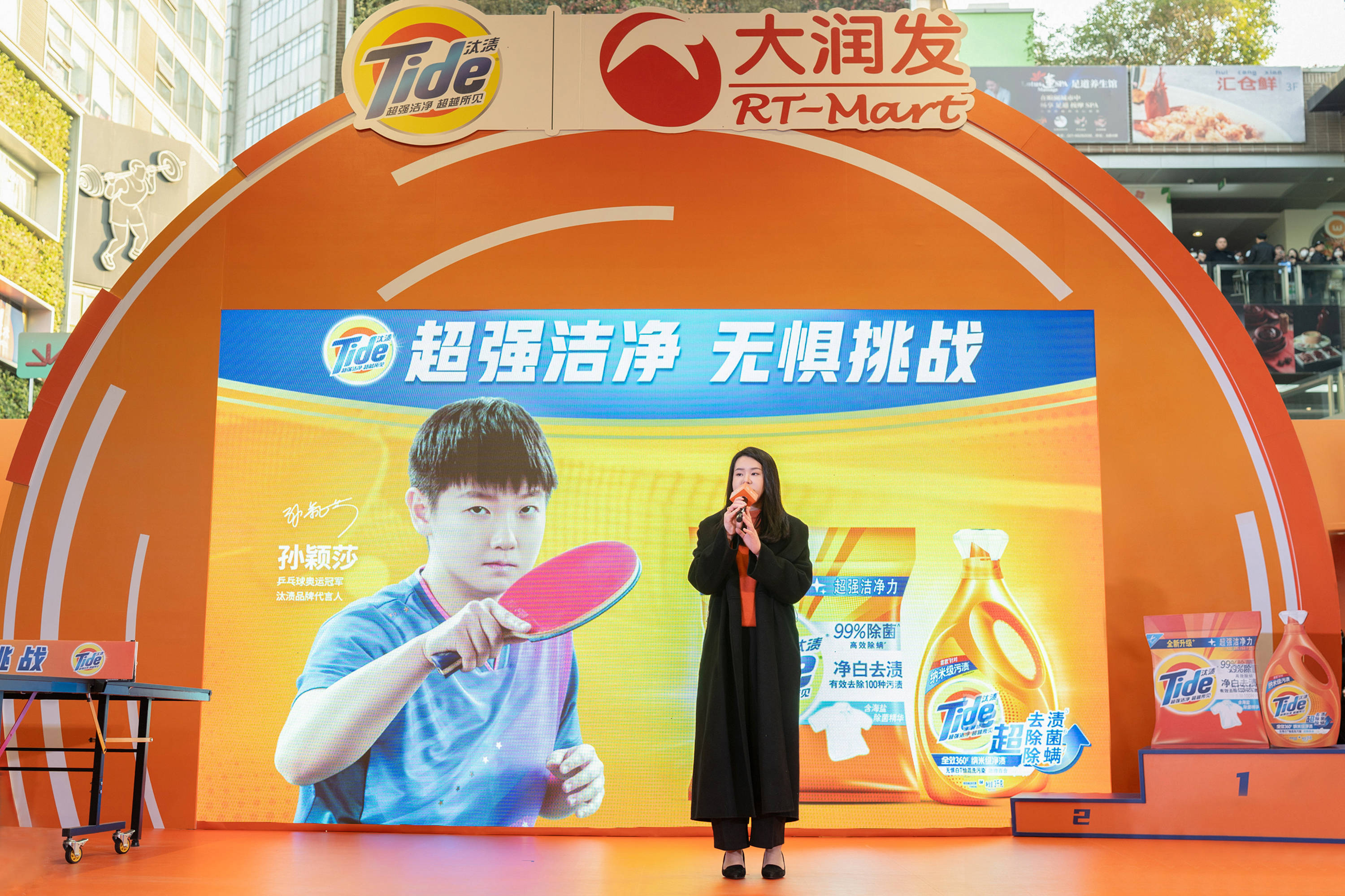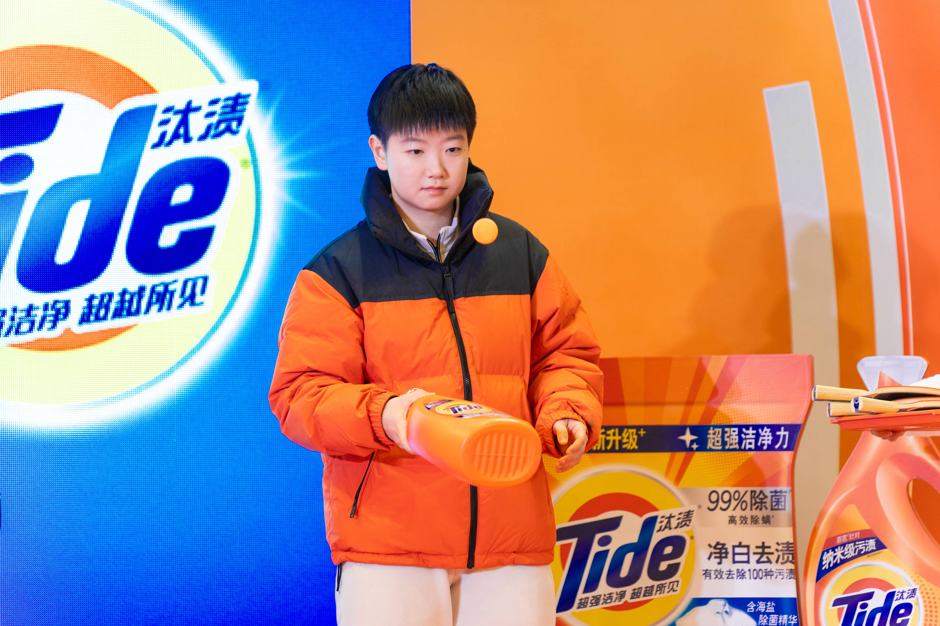 12月29日,宝洁旗下织物护理品牌汰渍联合大润发在上海共同举办 “超强洁净,无惧挑战” 主题活动,本次活动特别邀请到了乒乓球奥运冠军、汰渍品牌代言人孙颖莎亲临现场。孙颖莎在国内外赛场上屡创佳绩、不断超越自我,此次出席汰渍活动旨在与广大消费者一同聚焦日常洗衣难题,通过生动有趣的互动挑战及眼见为实的洁净实验,引领现场观众共同见证汰渍产品的超强洁净科技。