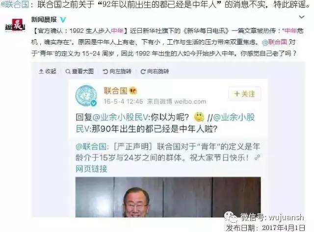 联合国在4月1日当天发布了一条微博,声明之前发出的“92年以前出生的都是中年人”的消息不实,对该消息进行辟谣。