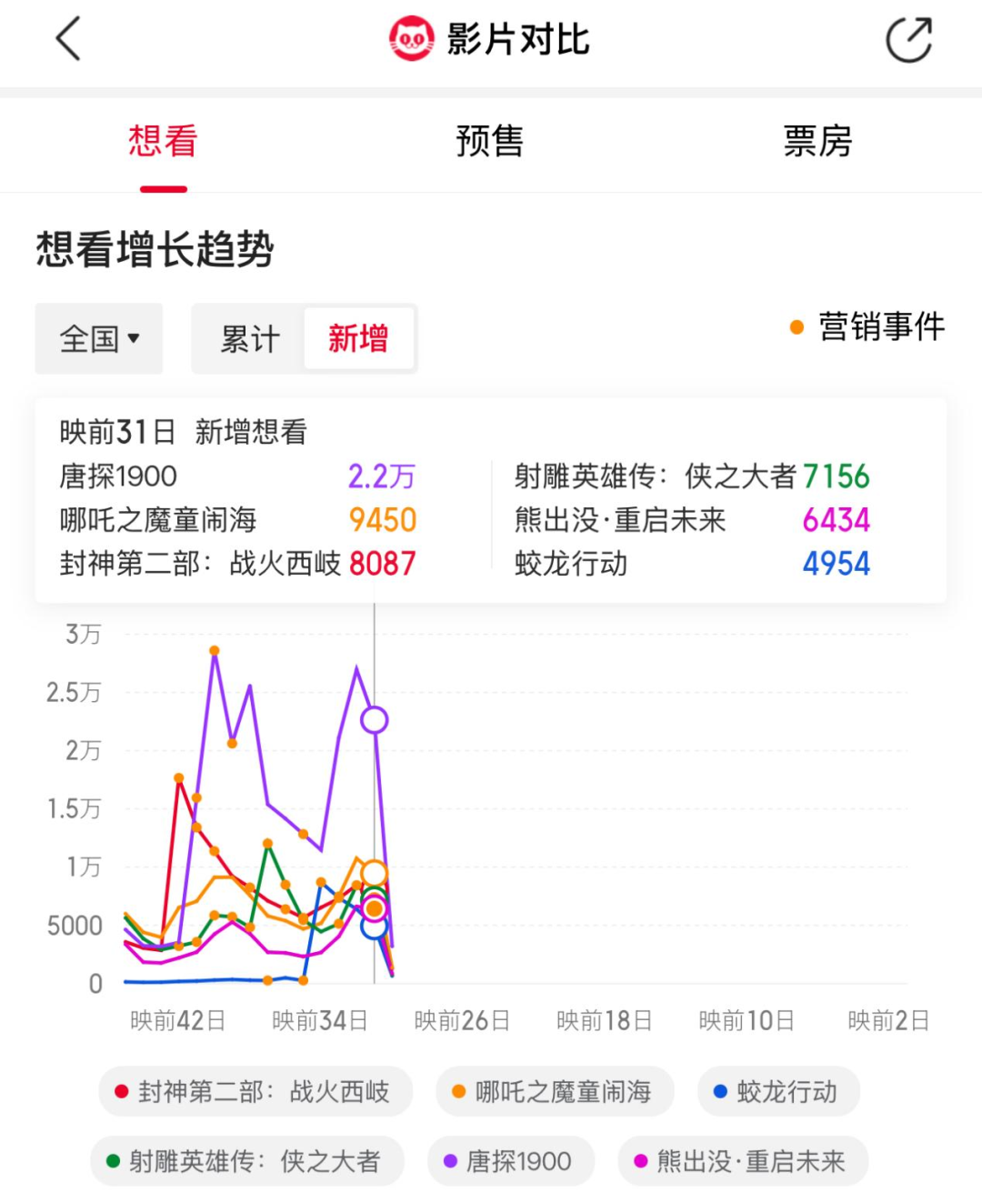 影片官宣定档当天,在仅发布一款海报且没有预告的情况下,单日猫眼想看人数超1.6万,第二日的单日想看数据更接近3万,目前的新增走势也做到了领跑档期。