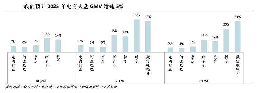 上图乃是交银国际对代表电商平台GMV的预测情况,尽管快手相对于行业大盘增速优势有放大之势(从2024年其增速是大盘的2.125倍,2025年预期为2.4倍),但受限于上述种种因素,其电商增速的绝对值压力是显而易见。
