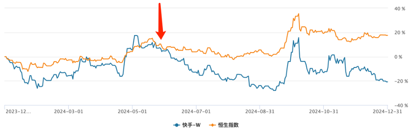 若用资本市场表现进行验证上述观点则更为清晰,2024年开局之后虽偶有波折快手和恒生指数大盘仍然保持了高度的相关性,属基本于同频共振,知道5月下旬之后,两条折线越发分离,直到如今。