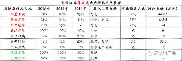 层次二:区域价值提升带来的收入来源改善雄安新区,听名字应该是最初以雄县和安新县为主,起步区面积约100平方公里,中期发展区面积约200平方公里,远期控制区面积约2000平方公里(超过深圳1992和浦东1210平方公里)。目前看,安新县728平方公里、容城县314平方公里、雄县514平方公里,接近满足远期规划。所谓区域价值提升,是指在雄安新区建设取得突破、京津冀一体化不断推进时,整个京津冀区域,尤其是相对落后的河北,区域价值都将大幅提升,这个层面我们主要考虑收入来源于这些区域的公司:华夏幸福(94%河北)、京汉股份(23%河北)、荣盛发展(21%河北)、廊坊发展(100%河北,目前没有实际储备,但集团有储备,未来发展可期)、北京城建(80%北京)。京津冀一体化已经提出三年,我们在2月26日三周年之际写了《京津冀三周年,买什么地产股怎么买?》里面提出,短买河北(主题投资最好介入、短期受益更直接、上涨更快);中买北京(大北京建设难度小于京津冀、进度快于京津冀、更加靠谱),天津在中、短期中都跑输;长期都买(长期来看,我们坚定看好京津冀在习近平任内必将取得重大进展)。